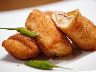 Risoles berisi daging cincang dan sayuran yang dibungkus dadar, dan digoreng setelah dilapisi tepung panir dan kocokan telur ayam.